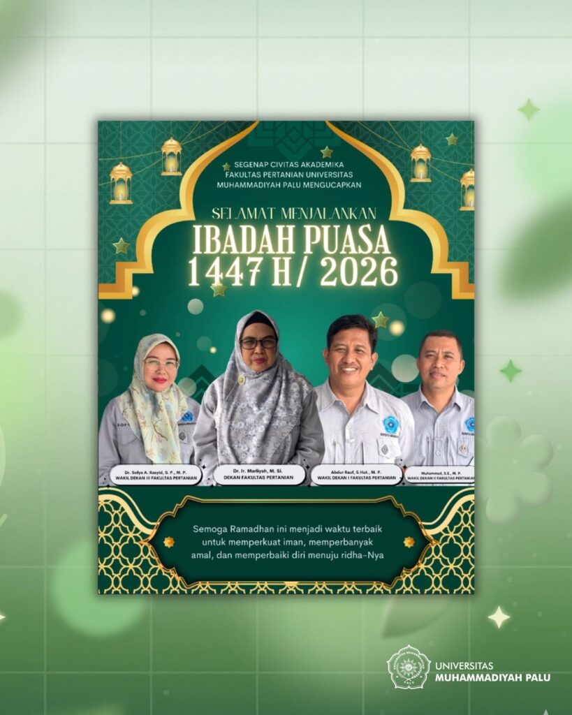 Civitas akademika Fakultas Pertanian Universitas Muhammadiyah Palu menyampaikan ucapan selamat menjalankan ibadah puasa Ramadhan 1447 Hijriah kepada seluruh umat Muslim. Ucapan ini disampaikan sebagai bentuk kepedulian dan kebersamaan dalam menyambut bulan suci yang penuh berkah. Ramadhan merupakan momentum yang tepat untuk meningkatkan keimanan dan ketakwaan kepada Allah SWT, serta memperbanyak amal kebaikan. Fakultas Pertanian UMPalu […]